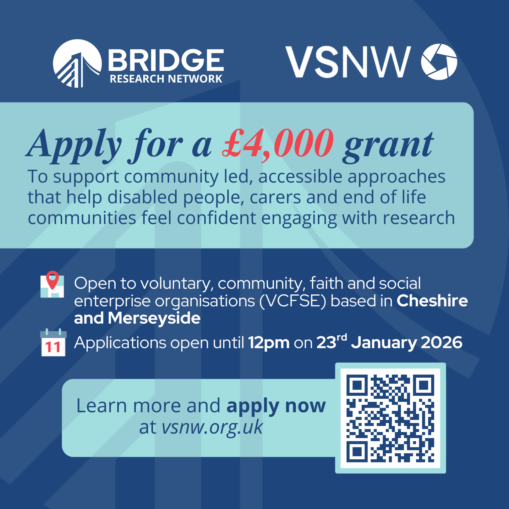 To be eligible, organisations must be based in Cheshire and Merseyside and be a registered charity, social enterprise, co operative, or an unincorporated voluntary or community organisation with an appropriate constitution. Applicants must work with disabled people, carers or people with lived experience of end of life care, be able to deliver activity within the pilot timescales, and be willing to share learning with the wider VSNW and REN partnership.